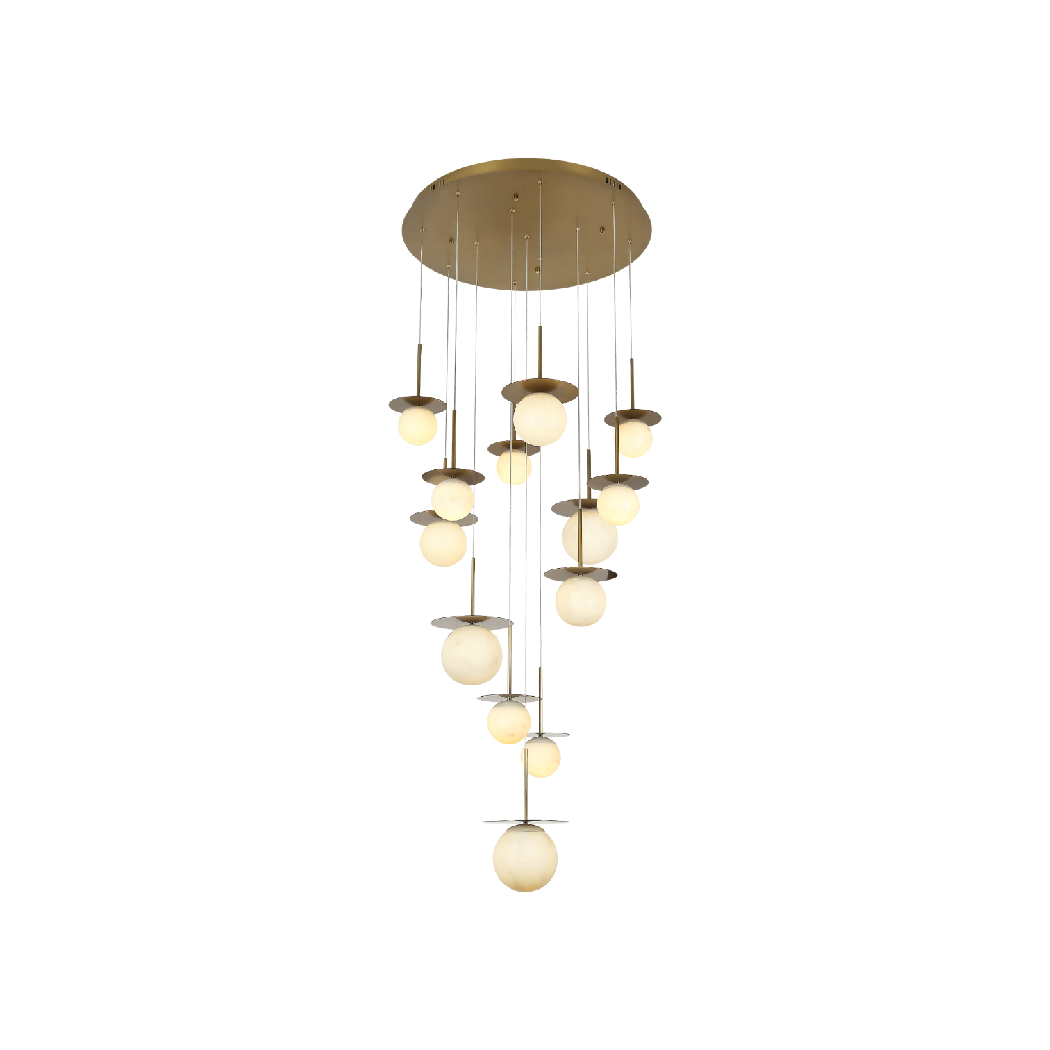 The Velora Sphere Chandelier features 13 round alabaster shades with adjustable wires, delivering elegant, customizable lighting that elevates any space with modern sophistication.